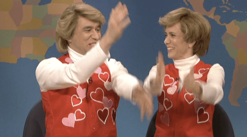 To kick things off, allow Garth (Fred Armisen) and Kat (Kristen Wiig) from Saturday Night Live, SNL, to serenade you with sweet, un-rehearsed tunes.